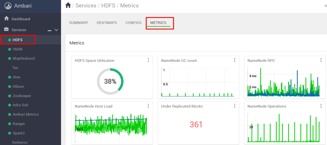 在 Ambari 旧版 HDFS 监控,只能展示有限的指标,自定义指标的门槛依旧很高,缺乏历史趋势分析能力。如下图所示: