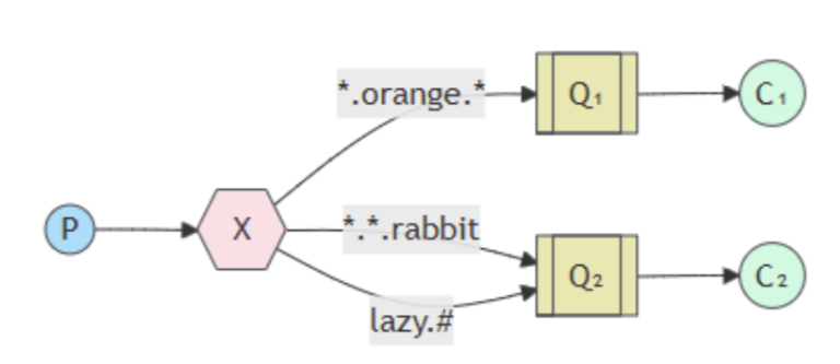 路由模式的升级版,支持通配符匹配RoutingKey。RoutingKey使用点分隔符(如"order.*"),交换机根据模式规则路由消息