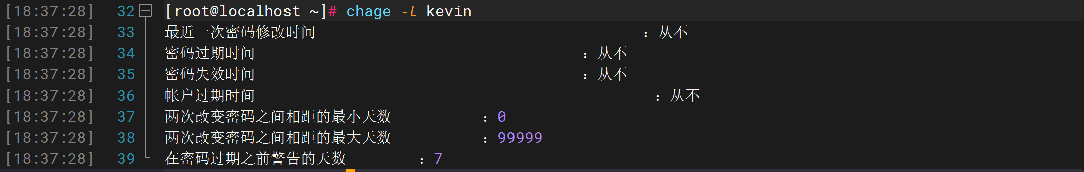 #用户名:密码:用户创建时间:密码最短使用期限:密码最长使用期限:密码过期提醒时间:密码过期后的宽容时间:密码过期时间:没用