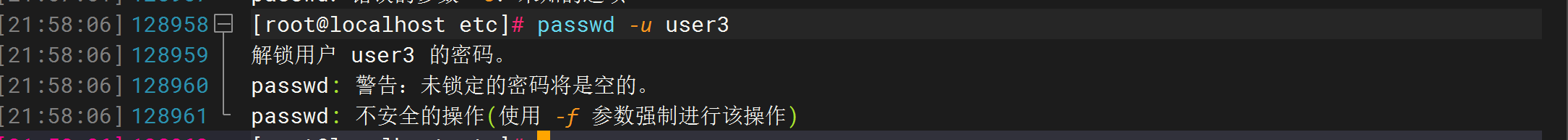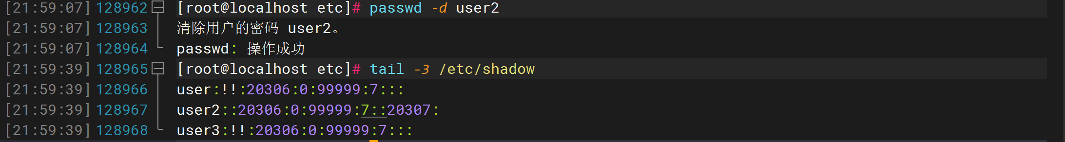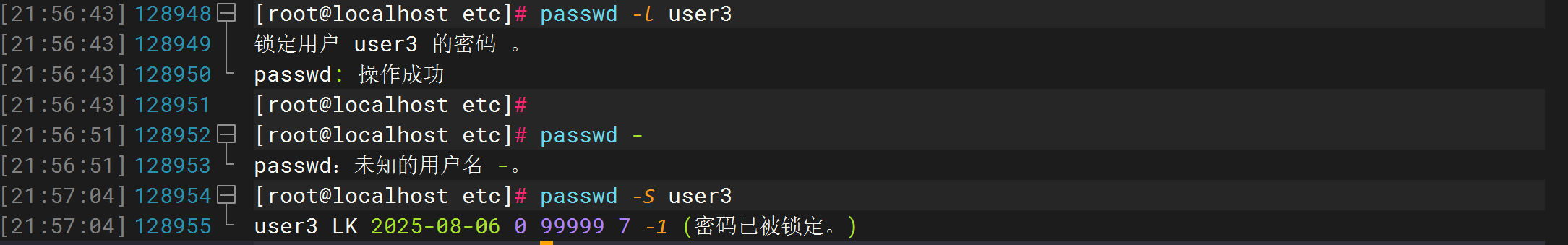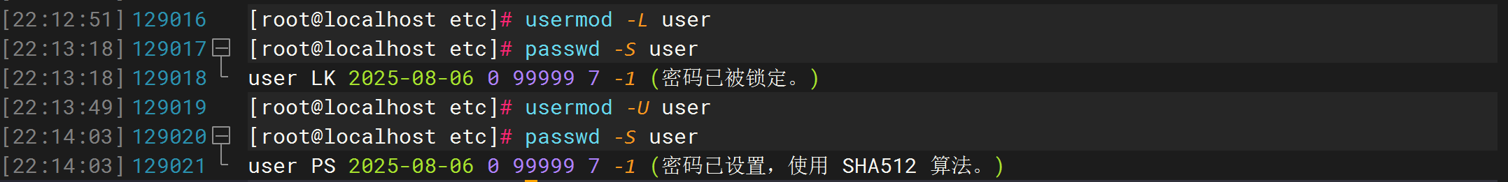 用户中 ! 表示用户密码被锁定,该用户无法登录操作系统。 !! 表示该用户没有设置密码。