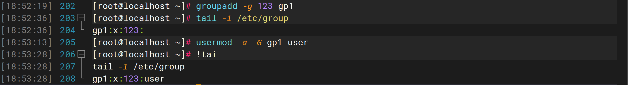 groupadd -g 12345 newgroup 创建新组gp1, 密码为123 添加user到gp1中