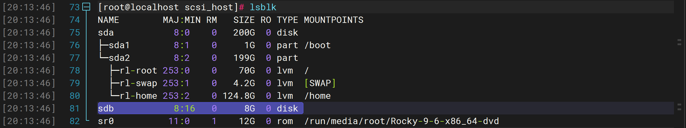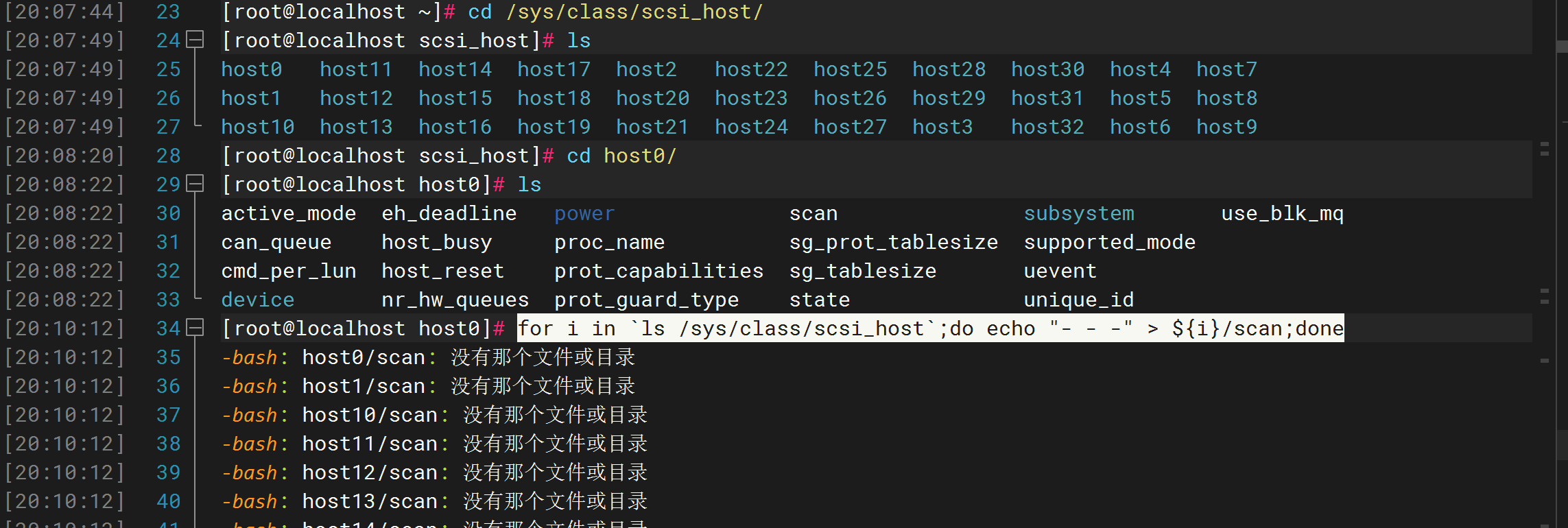 cd /sys/class/scsi_host目录名下输入:for i in `ls /sys/class/scsi_host`;do echo "- - -" > ${i}/scan;done