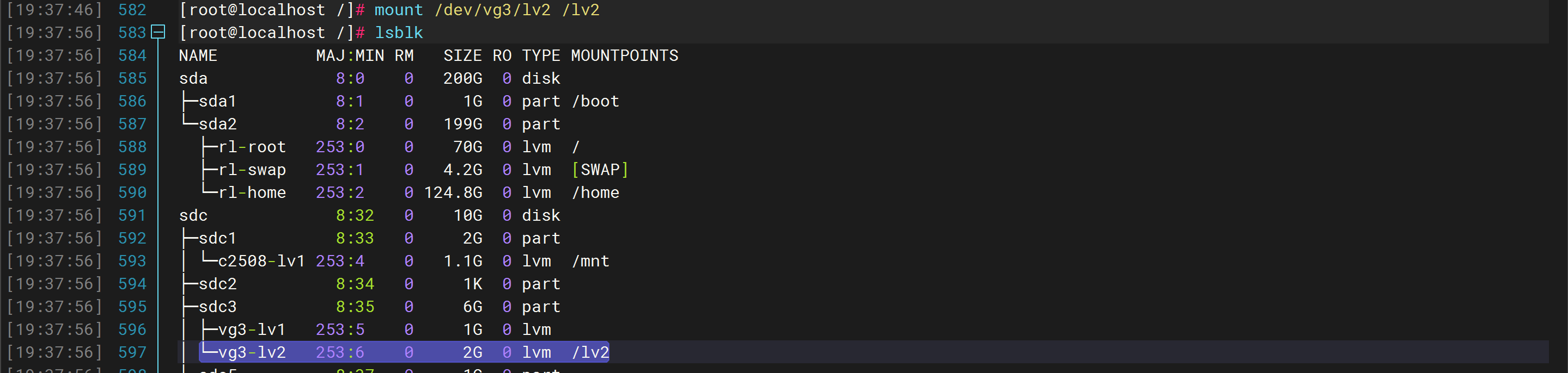 lvextend /dev/vg2/lv2 -L +2G——e2fsck -f /dev/vg2/lv2显示无法继续——取消挂载:umount /lv2——检查e2fsck -f /dev/g2/lv2——识别resize3fs /dev/vg2/lv2——挂载mount /dev/vg2/lv2 /lv2