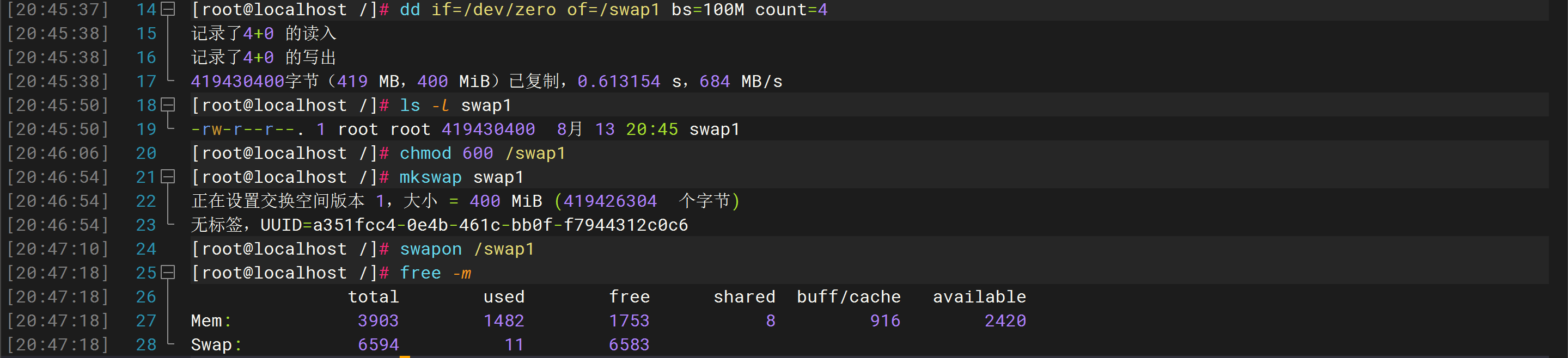 (2)从sda中抽取部分空间做扩容使用:dd if=/dev/zero of=/swap1 bs=1024M count=4 ——查看ls -l swap1——修改权限chmod 600 /swap1——格式化mkswap /swap1——挂载swapon /swap1