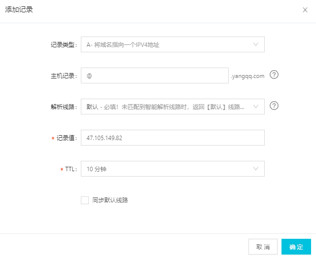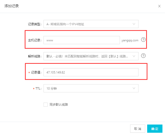 两条记录值,一个是www,一个是@,记录值是刚刚购买的阿里云服务器的地址(公),