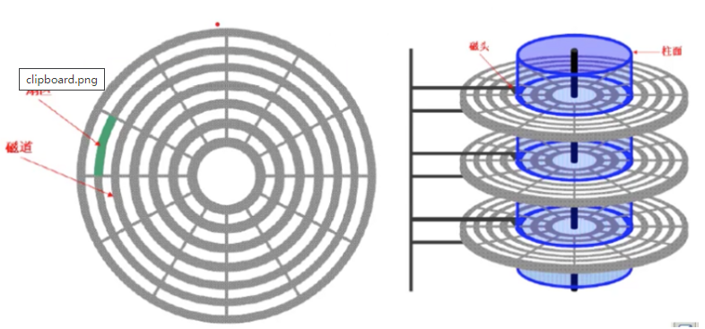柱面: 不同盘片半径相同的磁道组成的一个“柱面”。