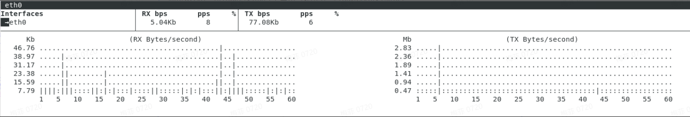 bmon默认能显示60s的历史网络监控数据,且默认单位Bytes