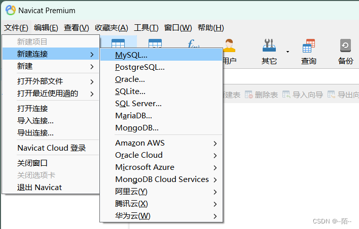 打开Navicat 点击‘文件’-->新建连接-->MySQL