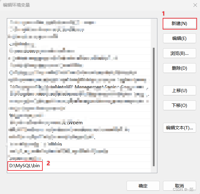 然后双击系统变量中的‘path’,然后‘新建’,输入变量值D:\MySQL\bin(MySQL的bin目录)