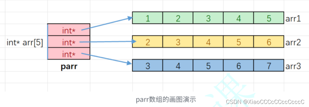 parr[i]是访问parr数组的元素,parr[i]找到的数组元素指向了整型一维数组,parr[i][j]就是整型一维数组i中第j个元素。上述的代码模拟出二维数组的效果,但是并非完全是二维数组,因为C语言中真正的二维数组每一行再内存中存储的地址是连续的,上述的每一行并非是连续的。