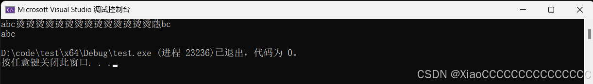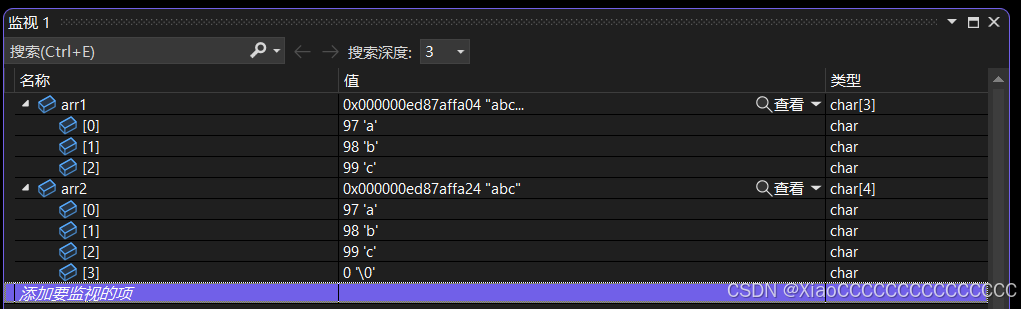 arr1 字符数组在打印的时候,打印了 a 、 b 、 c 后还打印了⼀些随机值,这就是因为 arr1 在末尾的地⽅没有 \0 字符作为结束标志,在打印的时候没有停⽌。但是 arr2 的打印就是完全正常的,就是因为 arr2 数组是使⽤字符串常量初始化的,数组中有 \0作为结束标志,打印可以正常停⽌。