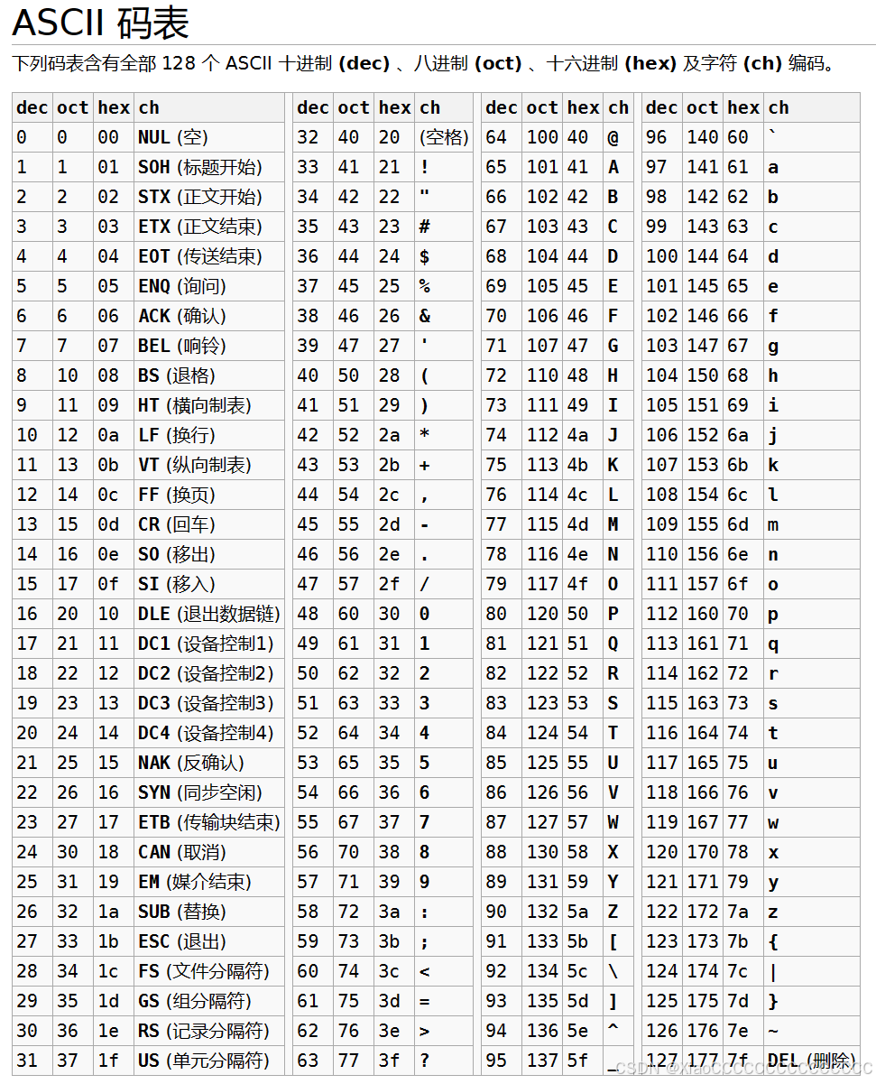 6.在这些字符中ASCII码值从0~31 这32个字符是不可打印字符,⽆法打印在屏幕上观察。