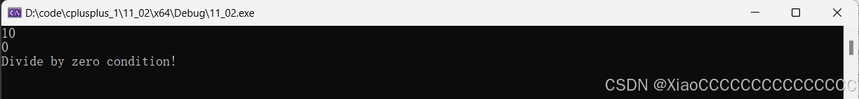 下面这段程序就是模拟的是当除法运算中除数为0是抛出异常的情况:这里的运行逻辑是在try子句中调用Func()函数,在func()函数中输入两个浮点型的变量,通过这两个变量调用Divide()函数,当除数为0的时候使用throw语句抛出异常,由于整个调用链中只有main函数中有catch子句且throw抛出的对象类型和catch子句接收的参数类型相同,则匹配到该catch子句执行catch子句中的内容。因为在while循环中,执行完之后会再次执行Func()函数。
