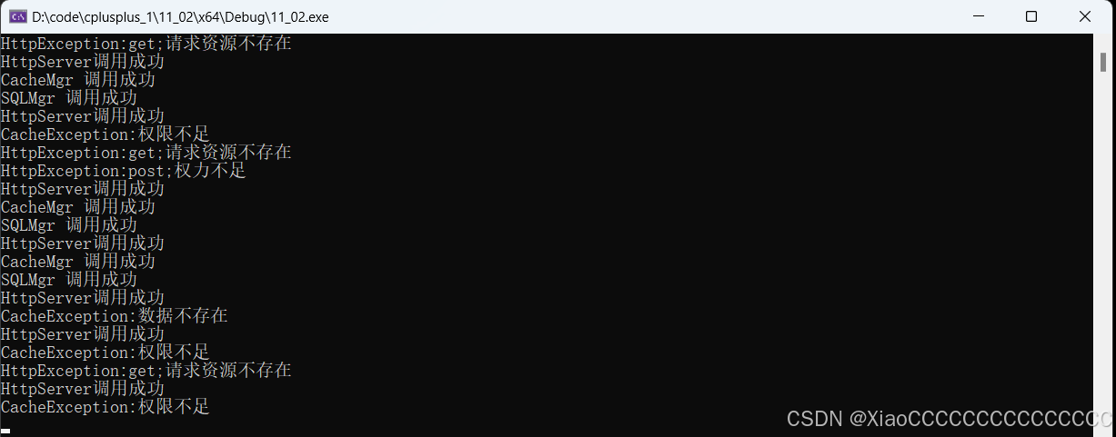 下列程序要完整的运行成功就需要每个模块都调用成功,这里抛出异常的情况使用随机数取模进行模拟。在每个模块都有可能抛出异常,然后统一在main()函数中通过基类的引用进行捕捉并处理。