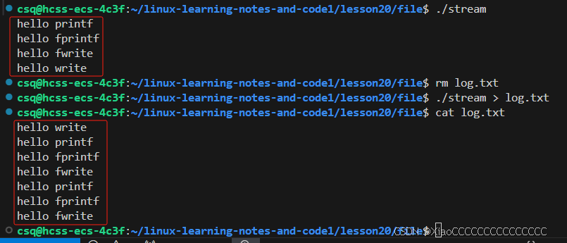 采用行缓冲的方式刷新时,执行库函数的时候就将数据刷新到内核级缓冲区中了,所以按照代码执行顺序,hello write在最后。