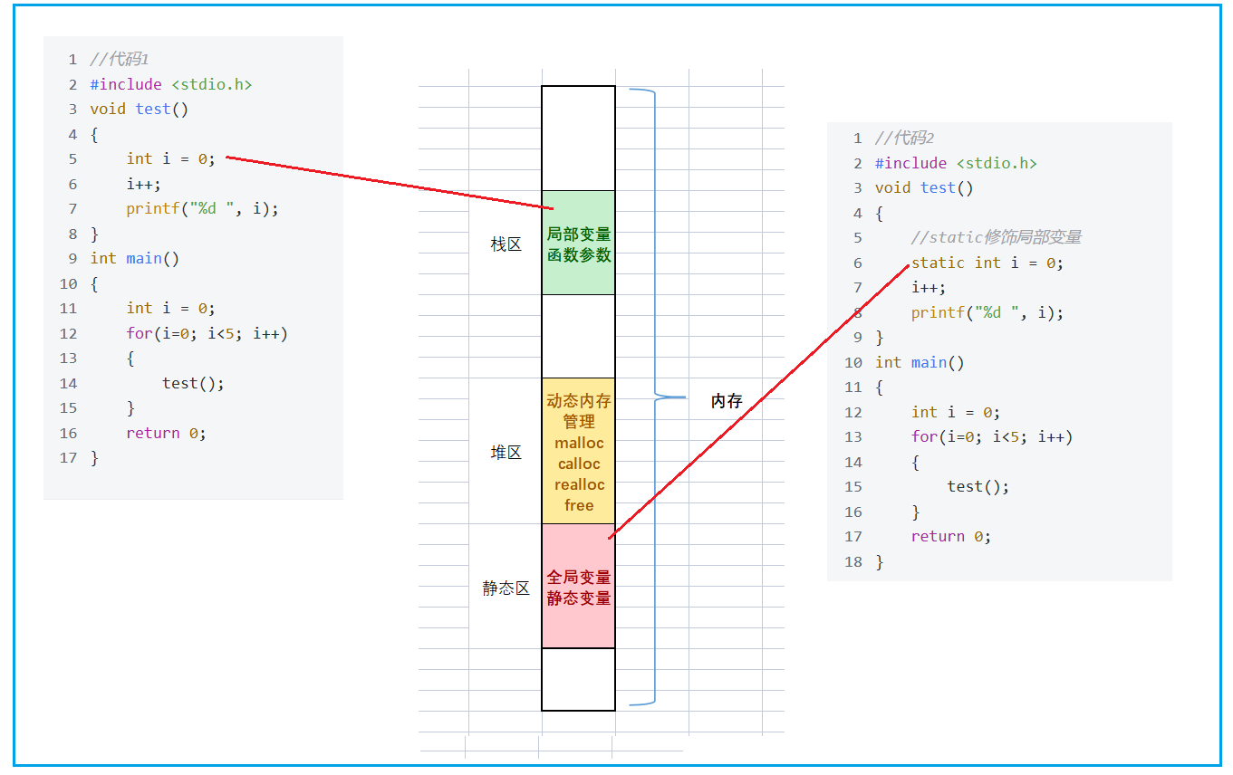 代码 2 中,test 函数中 static 修饰的 i 变量创建好之后,出函数的时候是不会销毁的,重新进入函数也就不会重新创建 i 变量,直接使用之前的 i 变量。