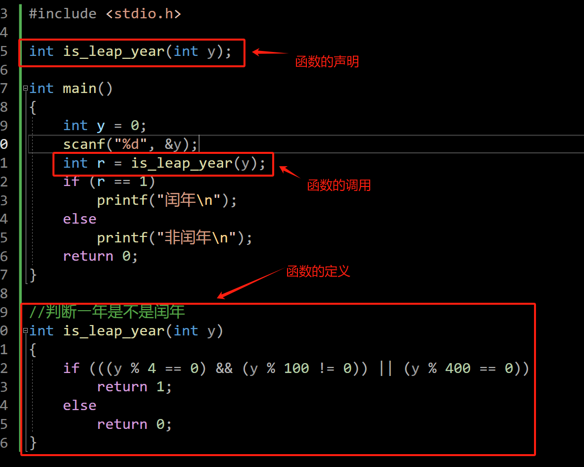 上述代码中,mian 函数中嵌套调用 scanf、printf 以及 get_days_of_month 函数,get_days_of_month 中嵌套调用 is_leap_year 函数。