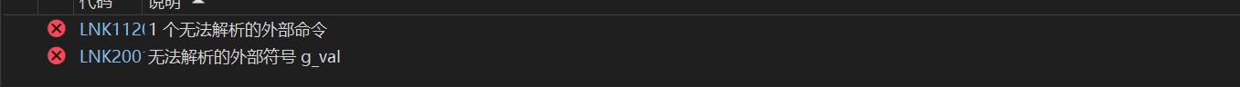 如上图,使用 static 修饰 add.c 文件中的全局变量 g_val 时,在 test.c 中进行调用,会出现链接性错误。