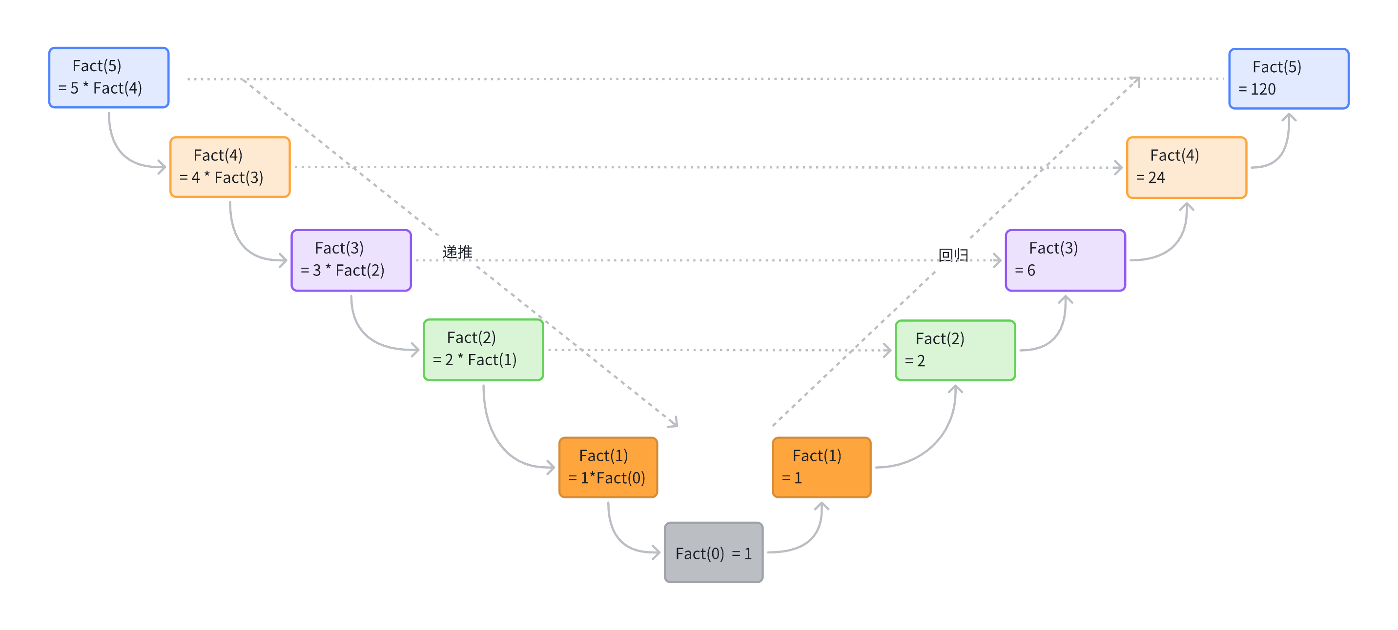 上述代码就如上述递归图一样,从 n = 5 一直往下递推,当 n = 0 时满足限制条件,返回 1,然后依次向上回归。