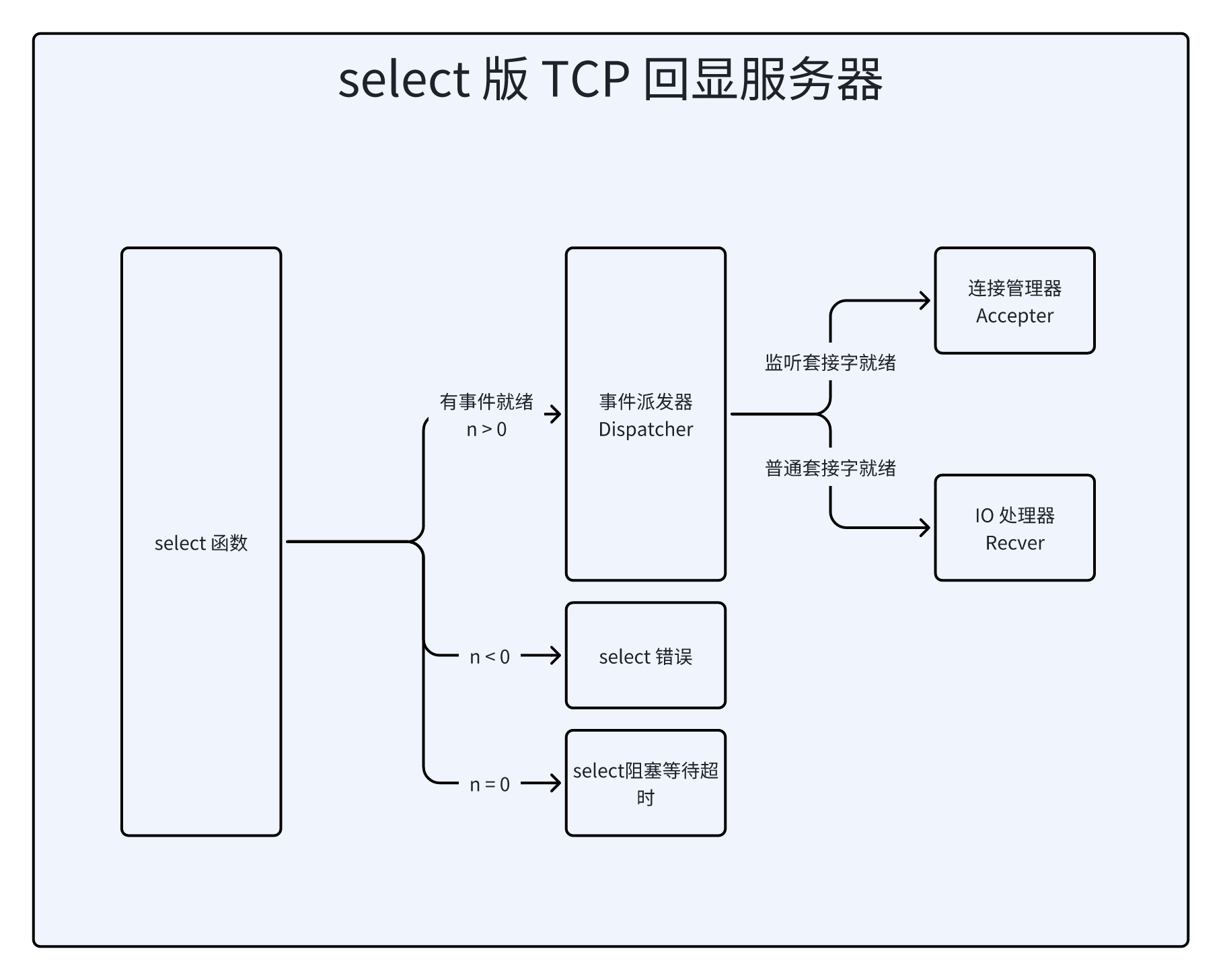 IO 过程分为等待数据和拷贝数据两个过程,而 select 只负责等待数据。系统提供 select 函数来实现多路复用(多路转接)输入/输出模型。select 系统调用是用来让我们的程序监视多个文件描述符的状态变化的,程序会在 select 这里等待,直到被监视的文件描述符有一个或者多个发生状态改变。select 是一种通过等待多个文件描述就绪的事件通知机制。从而避免为每个 FD 单独创建线程/进程,提升 I/O 效率。