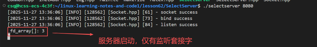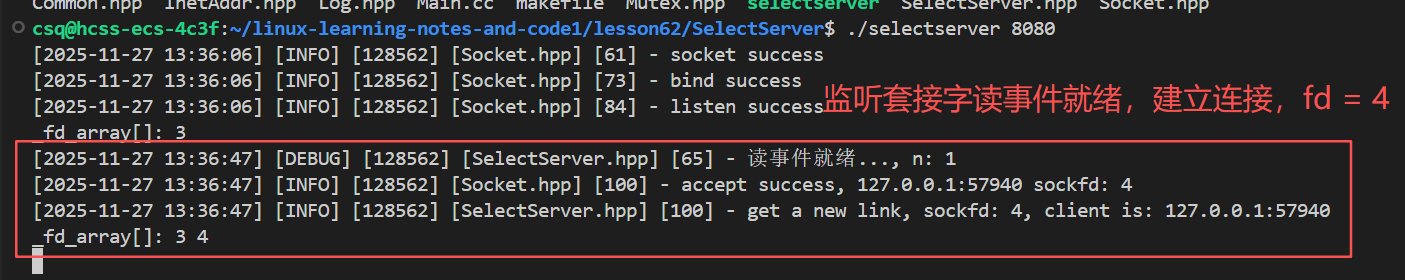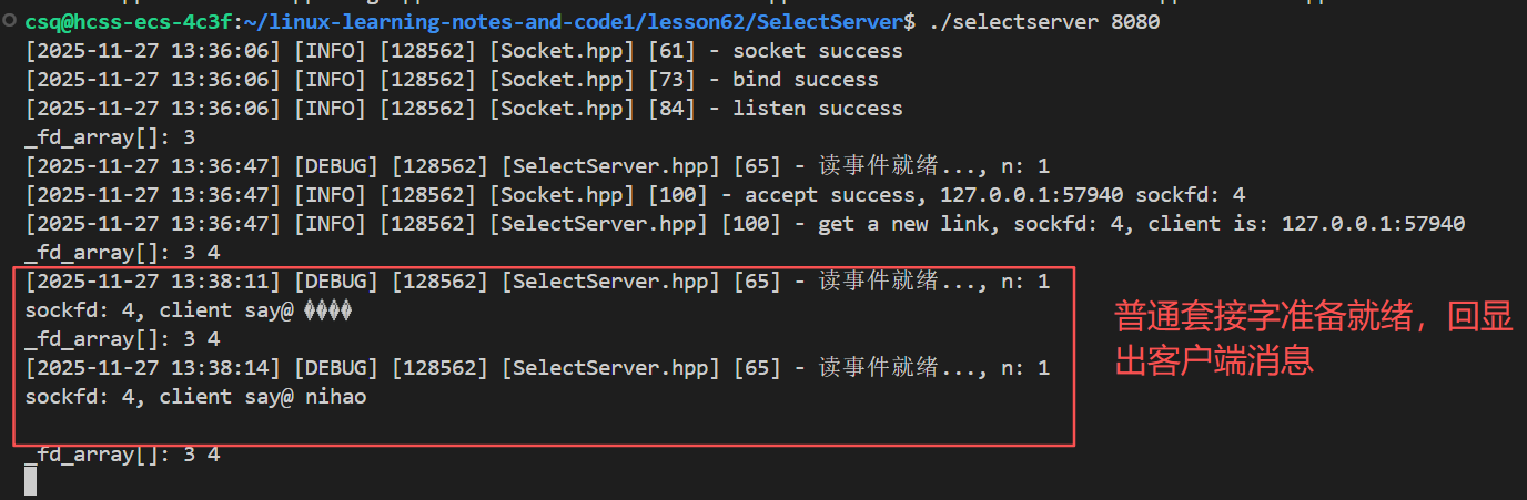 3. fd_set 集合需重复初始化,代码冗余:select 会破坏传入的 fd_set 集合:返回时,集合中仅保留 “就绪的 FD”,未就绪的 FD 会被清空。因此需要一个辅助数组来存储需要监控的 FD 集合,在每次 select 前进行初始化。