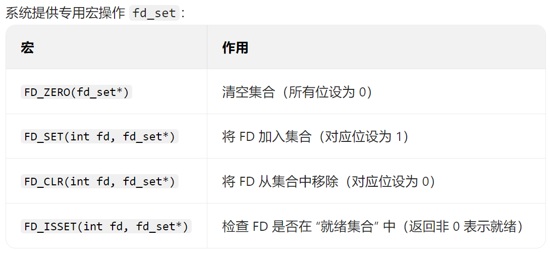 fd_set 集合:select 用于描述 “待监控 FD 集合” 的专用数据结构,本质是一个位图,每一位对应一个 FD(位为 1 表示监控该 FD)。