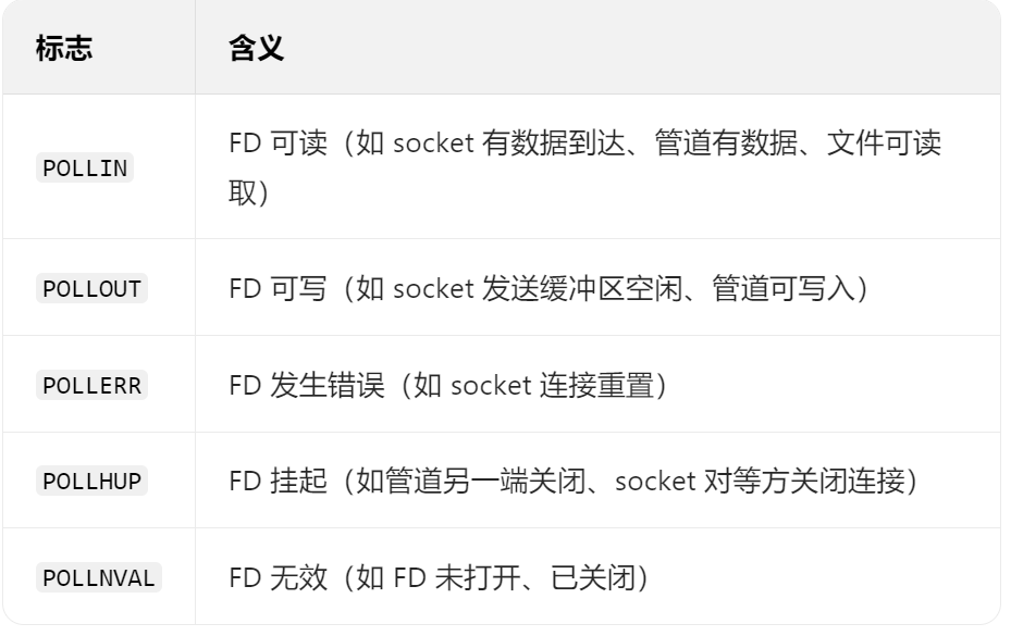 short revents; // 实际发生的事件(输出参数,由内核填充,如 POLLIN 表示可读就绪)