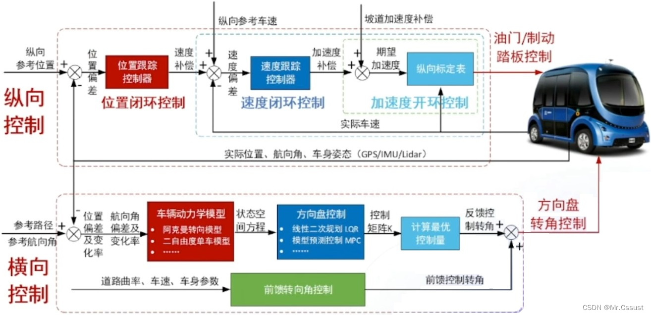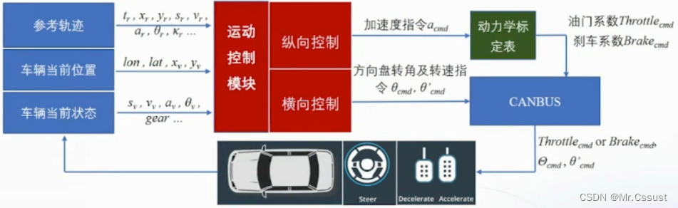 自动驾驶中的控制模块,通过操作车上的油门、刹车和方向盘,让车辆达到目标的速度、航向和位置。主要包括横纵向控制、动力学标定表和CAN总线协议等若干部分,示例如下: