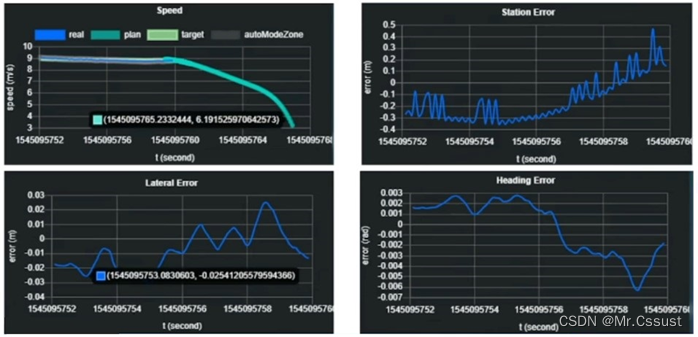 控制模块的开发高度依赖于车辆底盘的具体参数,DreamView的SimContrl功能中暂时还没有集成,所以只能基于实车进行调试验证。但是Apollo提供了远程实时访问的功能,同时也提供了播包的功能,都可以通过DreamView的PnC Monitor功能进行信号分析,示例如下: