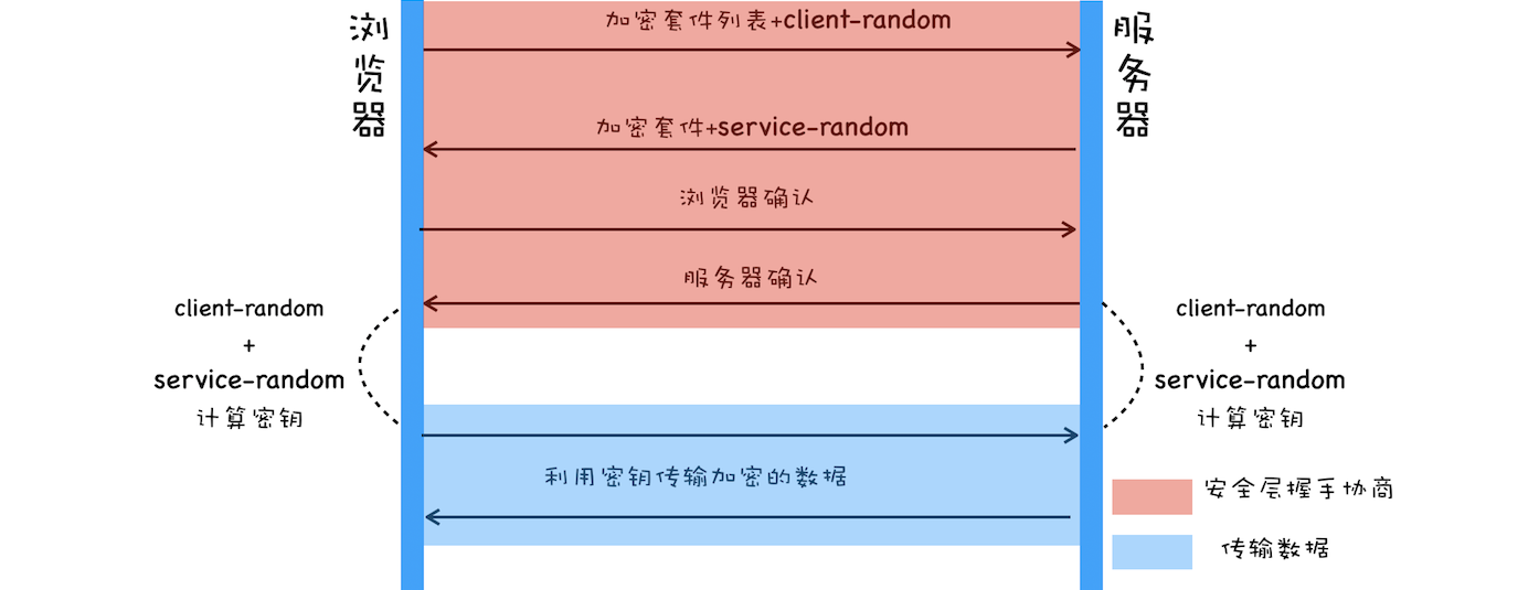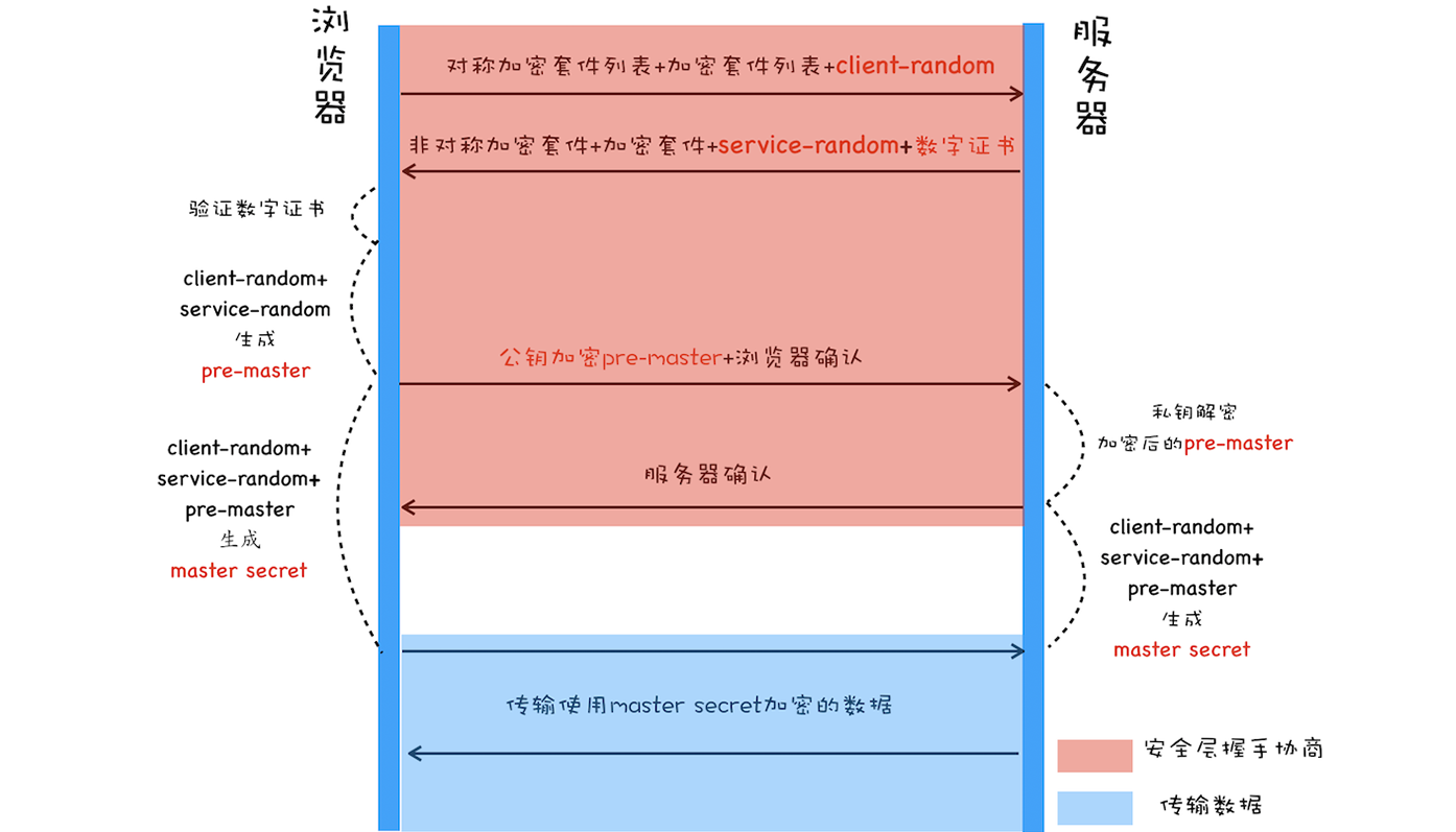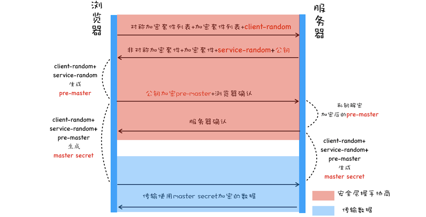 对称加密即加密和解密都使用相同的密钥。览器端和服务器协商确定加密套件(加密方法)和随机数,再使用相同的加密方法将 client-random 和 service-random 混合起来生成一个密钥 master secret,然后进行数据加密传输。但由于密匙明文传输,黑客很容易伪造或篡改数据。