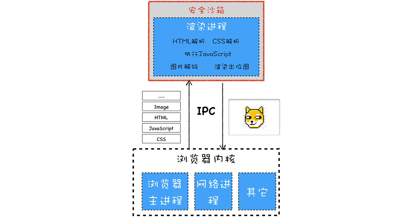 渲染进程需要执行 DOM 解析、CSS 解析、网络图片解码等操作,若存在漏洞,黑客很容易利用渲染进程执行下载的恶意网络内容发起攻击。现代浏览器的 安全沙箱 利用操作系统提供的安全技术将渲染进程和操作系统隔离,渲染进程在执行过程中无法访问或修改操作系统中的数据,因此用户将无法获取渲染进程之外的任何操作权限。渲染进程对系统资源的访问则通过浏览器内核的 IPC 通信来实现。