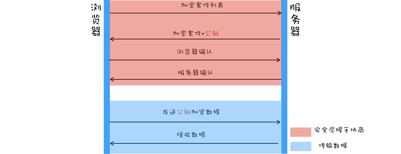 非对称加密指算法有 A、B 两把密钥,其中一把用来加密,另一把就用来解密。服务器将其中的一个密钥作为公钥明文发送给浏览器并对外公开,而另一个作为私钥不对外公开。但非对称加密不仅效率低,且公钥公开,不能保证服务器端发送给浏览器端的数据安全。