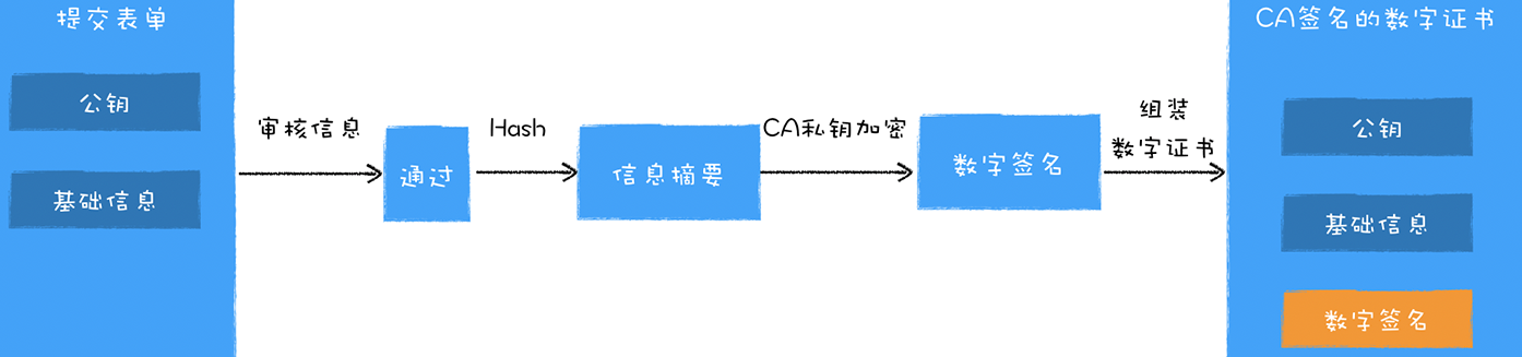 首先 CA 使用 Hash 函数计算证书的明文信息并得出信息摘要;然后再使用 CA 的私钥 对信息摘要进行加密,密文即为 CA 签发的数字签名。可通过数字签名来验证证书是否是该 CA 颁发的。