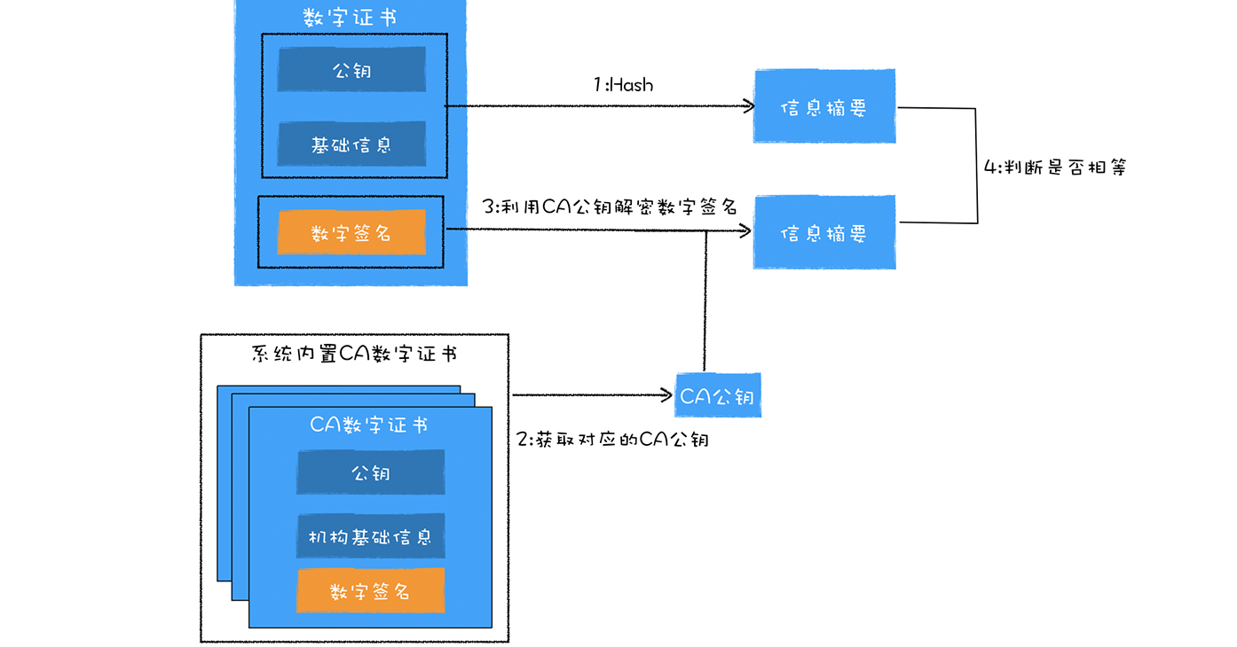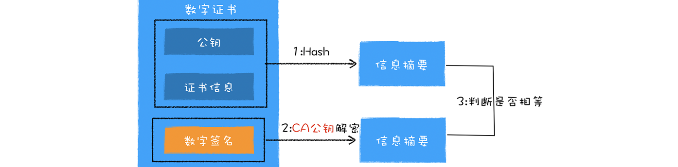 **验证证书是否由合法的 CA 机构颁发:**浏览器使用签名时相同的 Hash 函数计算证书明文信息并得到信息摘要对比用 CA 公钥解密签名数据得到信息摘要,若一致则可以确认证书合法。