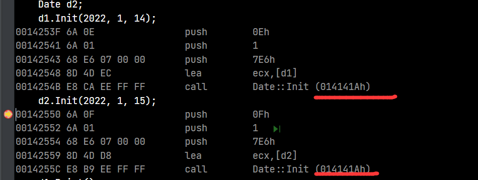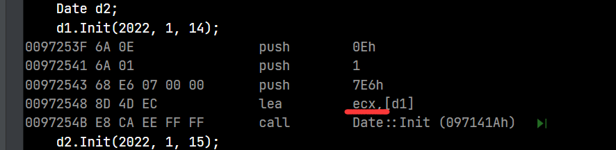 可以观察到VS2019把this指针的值放到了ecx寄存器中,而不是像其他变量一样直接push,(push表示压栈,lea表示取地址,VS2019通过寄存器储存this指针的值).