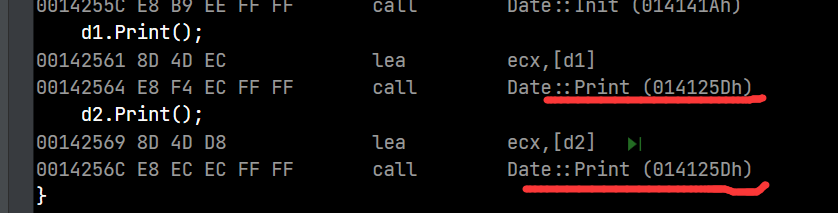 我们知道普通成员函数是放在公共代码段的,通过上图也可以验证,都找的同一个函数地址,但是d1和d2的数据是不同的,Print如果真的没有参数是怎么知道是d1的调用的它还是d2调用的它呢,这就引出了this指针。