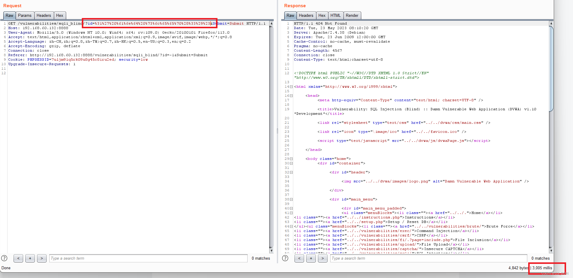 提交URL编码的payload(参数是url传递),因为参数1存在于数据库中,逻辑关系为and,左右两边条件都为真,整个逻辑运算结果为真,payload成功执行 ,数据库产生延时效果