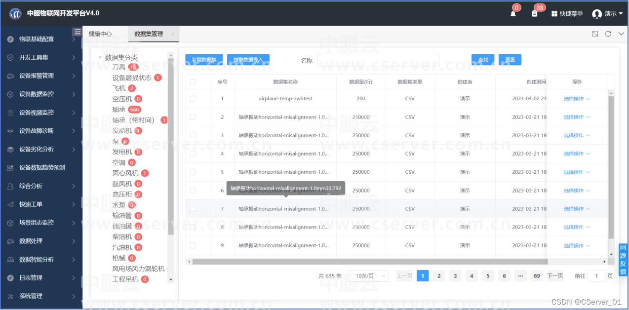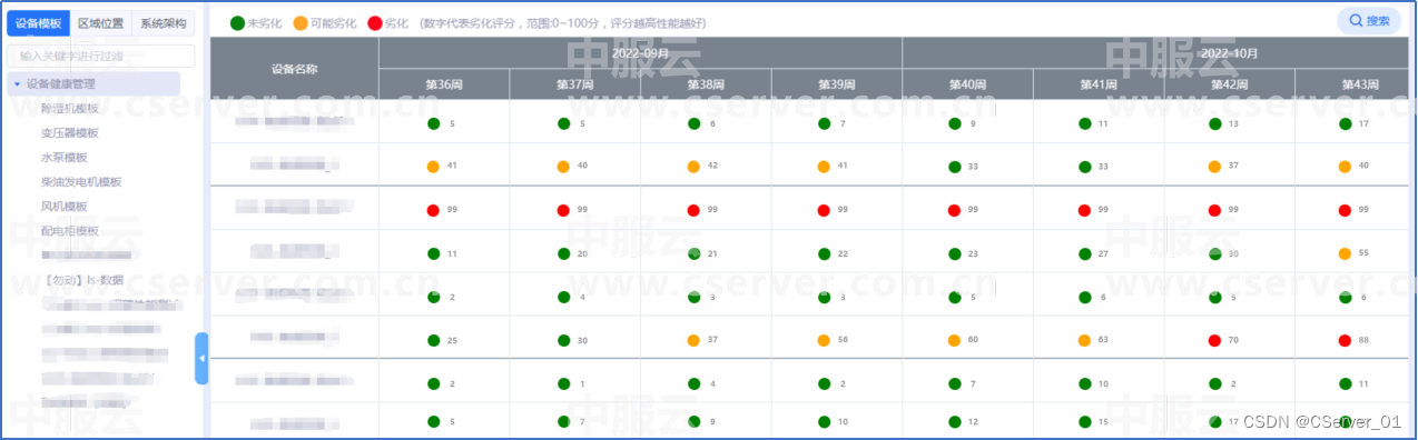 设备劣化是设备在使用过程中,由于零部件磨损、疲劳或环境造成的变形、腐蚀、老化等原因,使原有性能逐渐降低的现象。由于设备劣化,可表现在设备表面腐蚀、运动过程中的噪音增大、振动加剧、温度升高、功率下降等,有些参数可以通过传感器测得。通过获取长时间的数据,对数据的变化进行分析,就能得到设备的劣化程度。中服云物联网开发平台4.0版本给出了6种劣化分析模型: