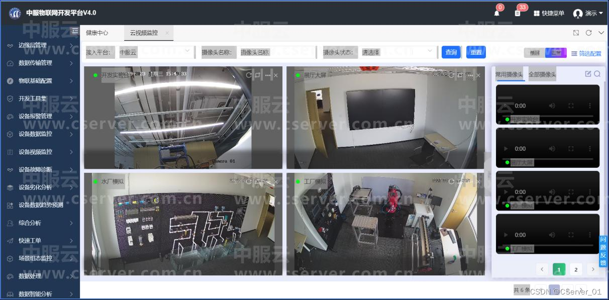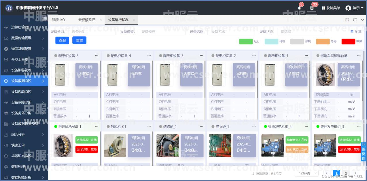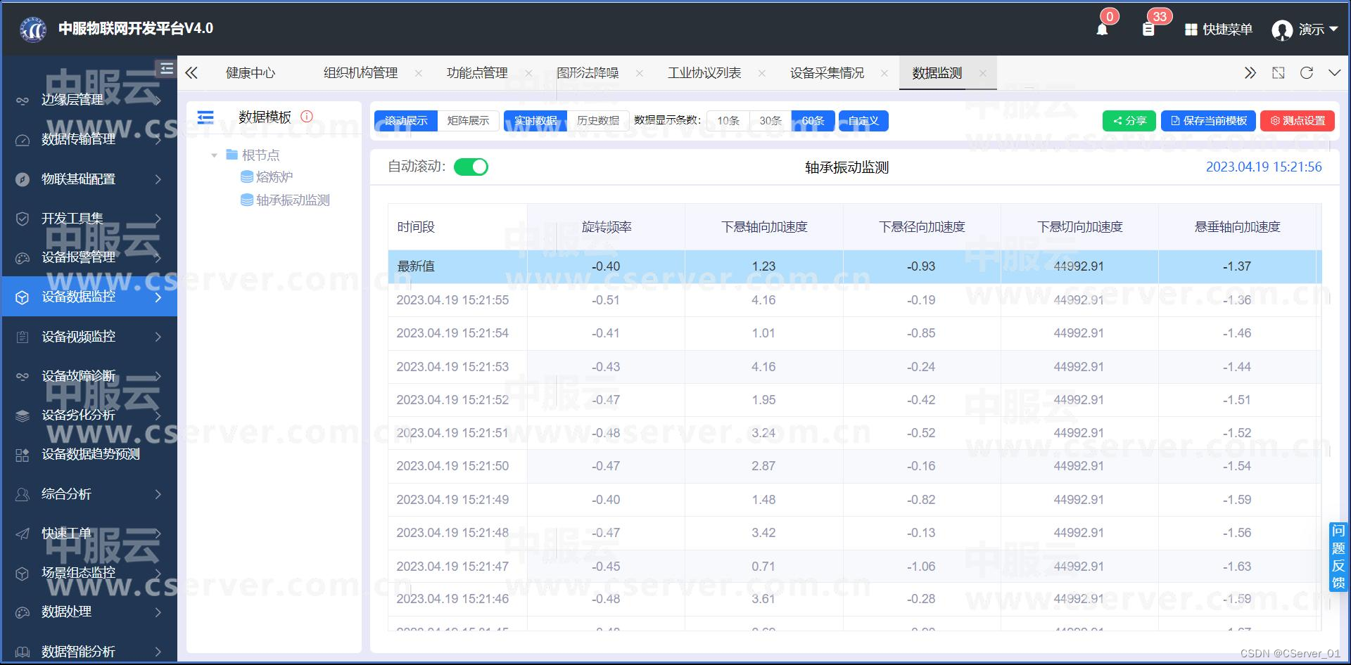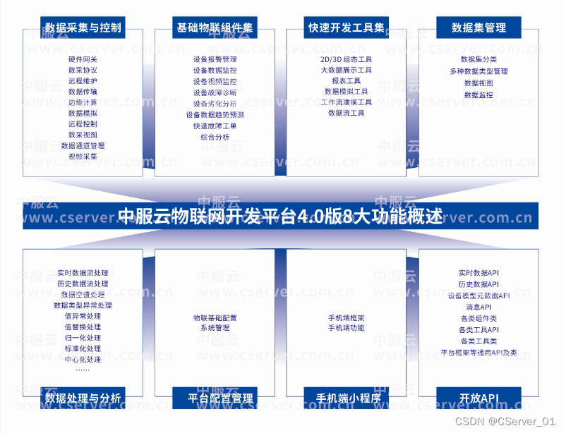 中服云物联网开发平台4.0版主要包含8大能力:数据采集与控制、基础物联组件集、快速开发工具集、数据集管理、数据处理与分析、平台配置管理、手机端小程序、二次开发接口。是集开发、运行支撑、快速组装应用、数据调试仿真于一体的数据自动获取、数据分析、数据展示平台。其是设备与业务系统深度融合纽带,是数智化转型必不可少的核心支撑平台。