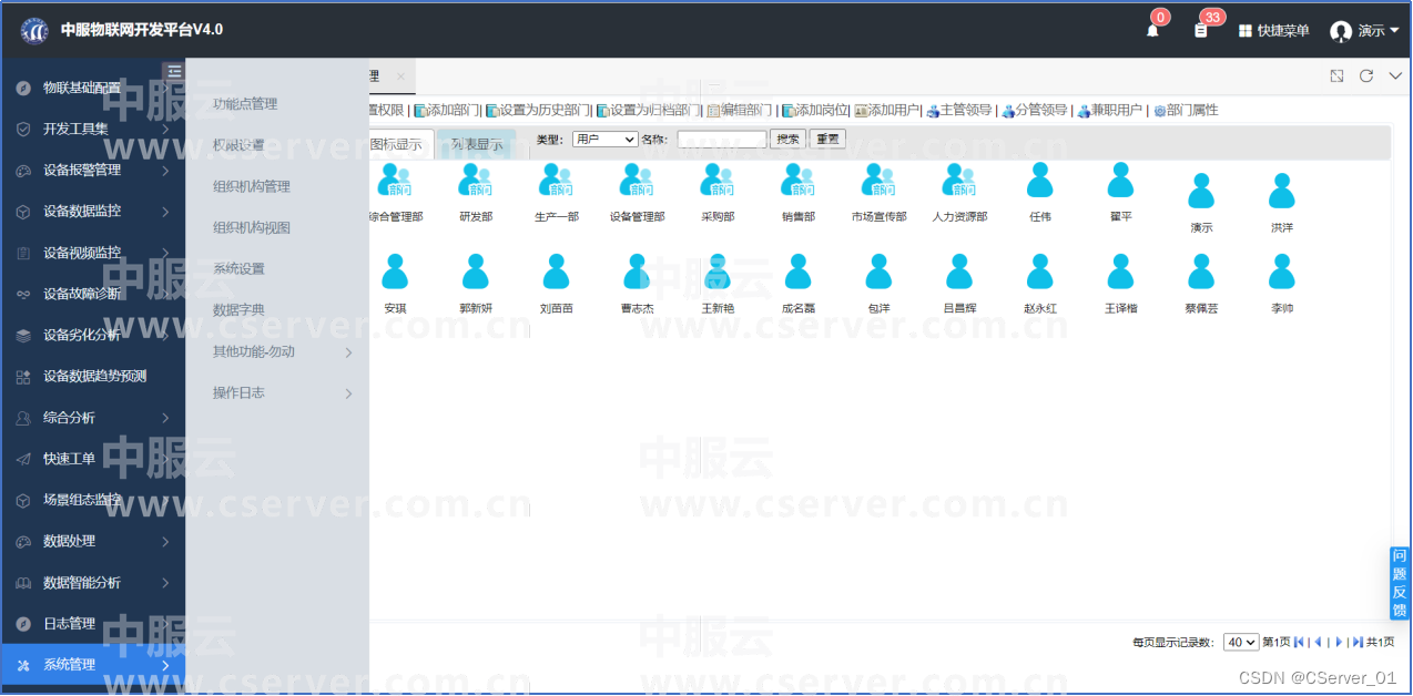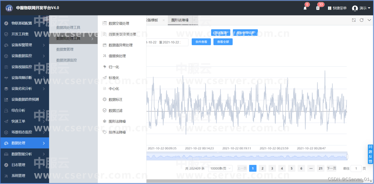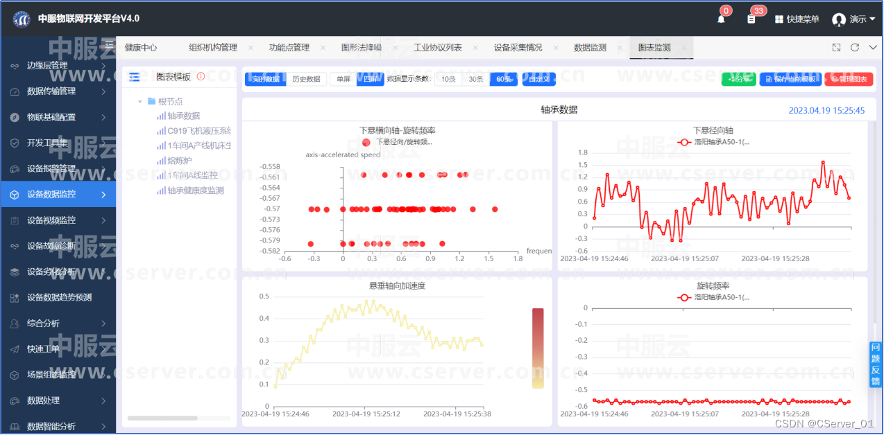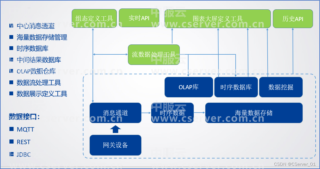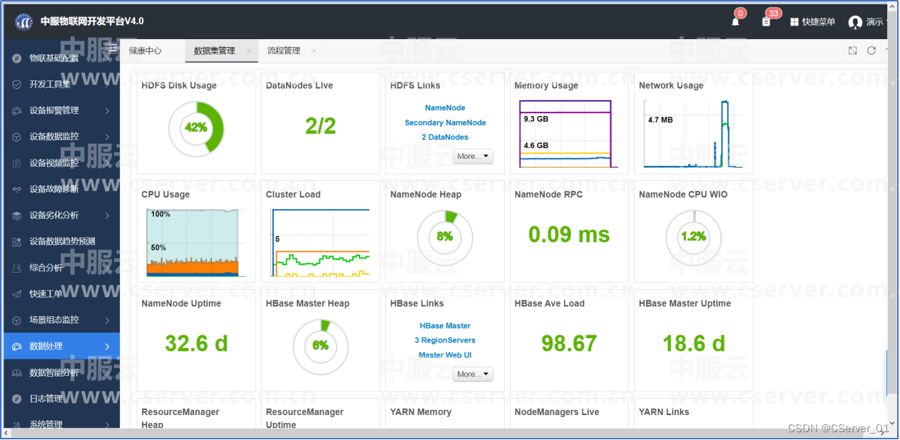 中服云物联网开发平台4.0版主要包含8大能力:数据采集与控制、基础物联组件集、快速开发工具集、数据集管理、数据处理与分析、平台配置管理、手机端小程序、二次开发接口。是集开发、运行支撑、快速组装应用、数据调试仿真于一体的数据自动获取、数据分析、数据展示平台。其是设备与业务系统深度融合纽带,是数智化转型必不可少的核心支撑平台。