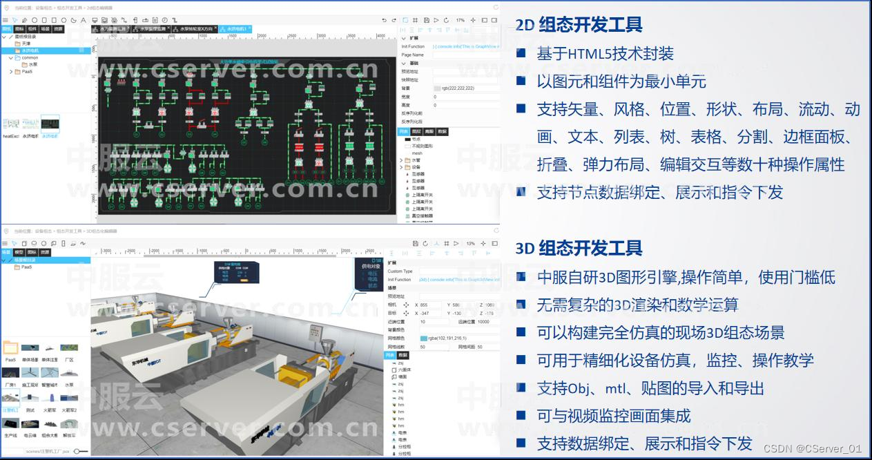 可视化2D、3D组态页面设计,设备数据动画、灯光、文字、图表绑定等,在线编辑在线部署在线使用。包括3000多个不同行业组件。具有动态数据显示和直接控制能力。