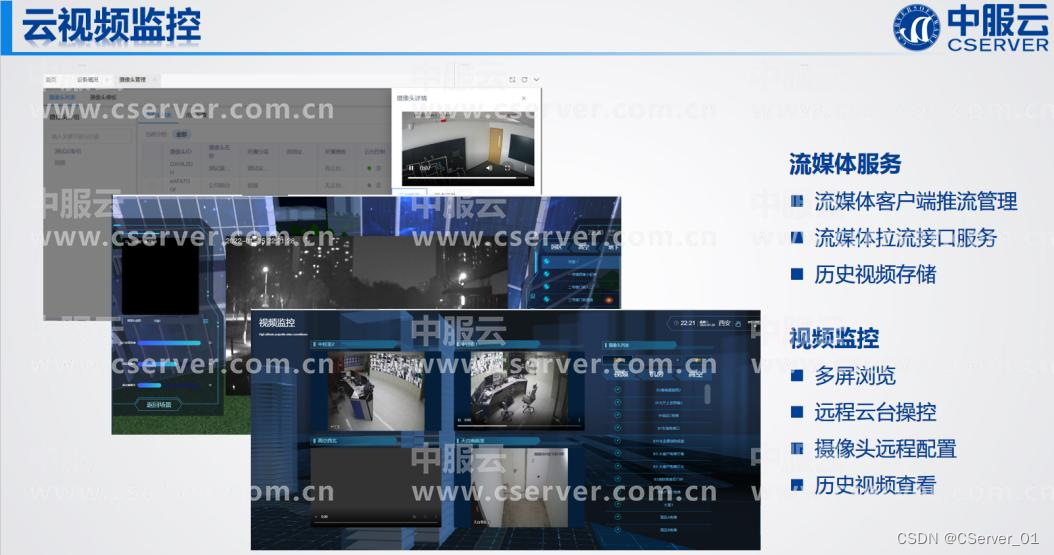 用视频的方式,直观的显示设备的外部状态、运行情况、性能、位置、故障、上线等。包括摄像头管理,云视频实时监控,历史视频点播。实现单屏、四屏直播,按时间等条件查询历史视频。