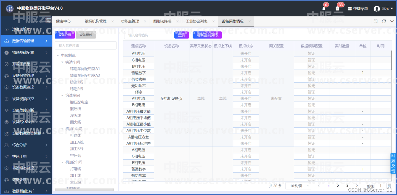 实时监控数采状态:在线、离线、真实还是模拟、离线提醒。