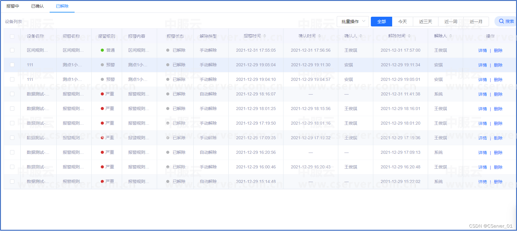报警管理:报警列表动态滚动显示、报警确认、报警处理