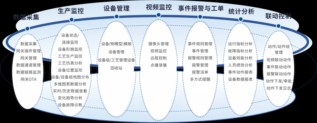 设备状态 / 连接监控、设备形貌监控、工艺生产监控、工艺仿真分析、设备位置监控、设备 / 设备组地图分布、多维图表数据分析、实时 / 历史数据查看、变化趋势分析、设备故障诊断等。
