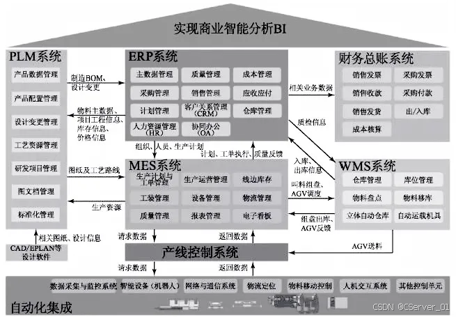 企业信息化建设可采取“总体规划、分步实施”的原则,避免出现信息孤岛,ERP、PLM、MES和WMS系统是智能工厂信息化建设的重点,各系统的架构和功能设计以及系统间数据的接口设计是信化规划的关键,各系统应实现信息的无缝集成和数据交互,以实现企业“智能制造”的最终目标。
