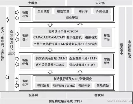 基于企业系列标准的支持和企业级别的信息安全要求,在信息物理融合 系统(CPS)的支持下,构建智能设计、智能产品、智能经营、智能服务、智能生产、智能决策六大系统。