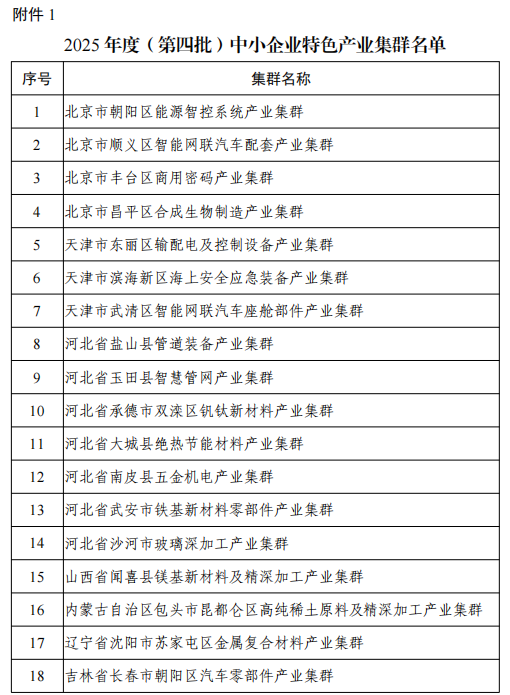 工信部近日公布2025年度(第四批)中小企业特色产业集群名单,包括北京市朝阳区能源智控系统产业集群、北京市顺义区智能网联汽车配套产业集群等全国100个特色产业集群入选。同期,2022年度(第一批)中小企业特色产业集群复核通过名单予以公布。据悉,中小企业特色产业集群有效期为三年。