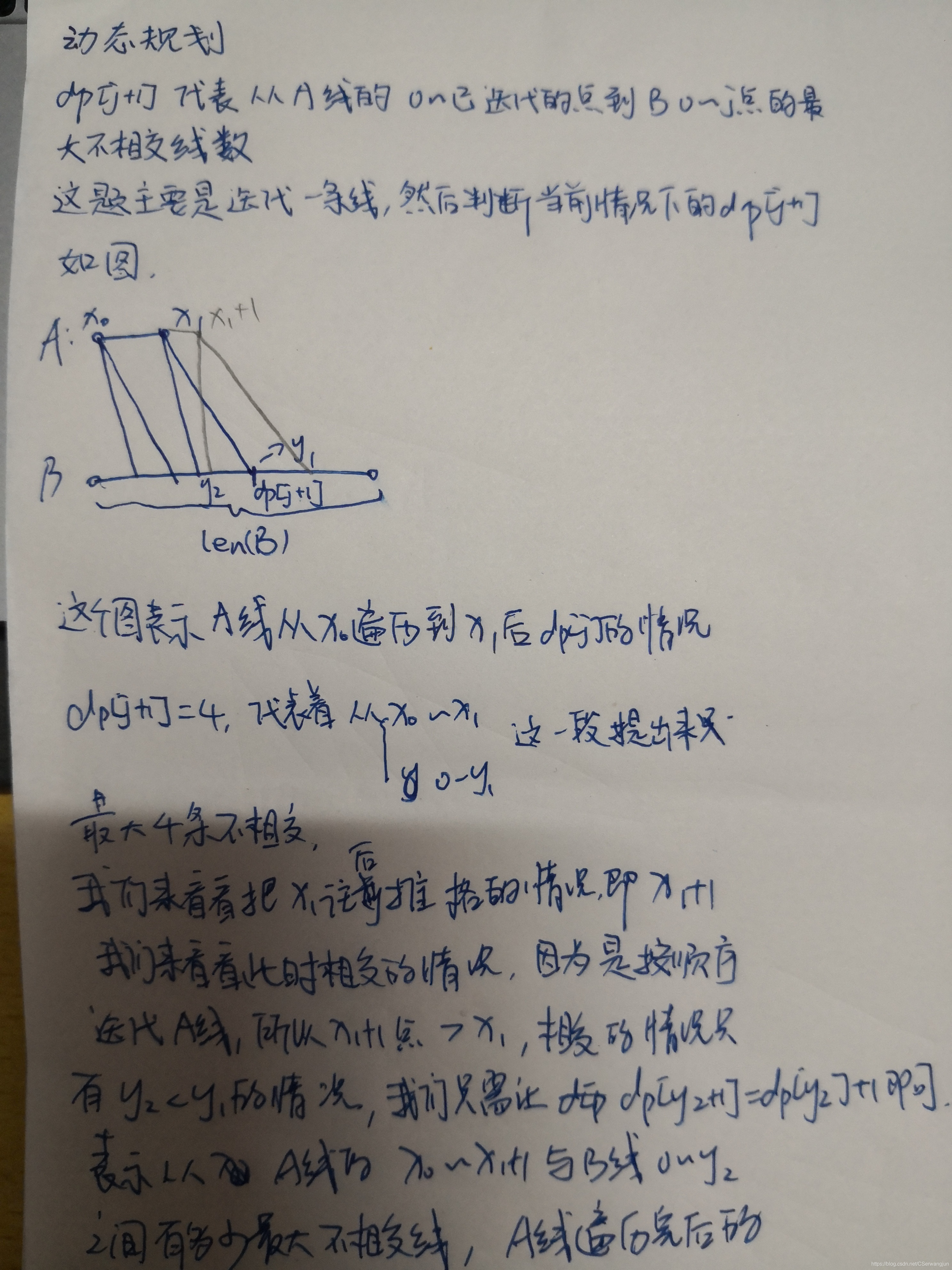 在每一个迭代步,dp[i]的含义是,从A线的0-k点,到B线的0-i点最大的不相交线数量