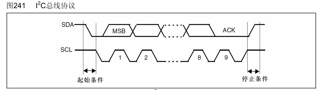 - 起始条件:SCL为高电平时,SDA从高到低(下降沿产生起始条件)主机发送